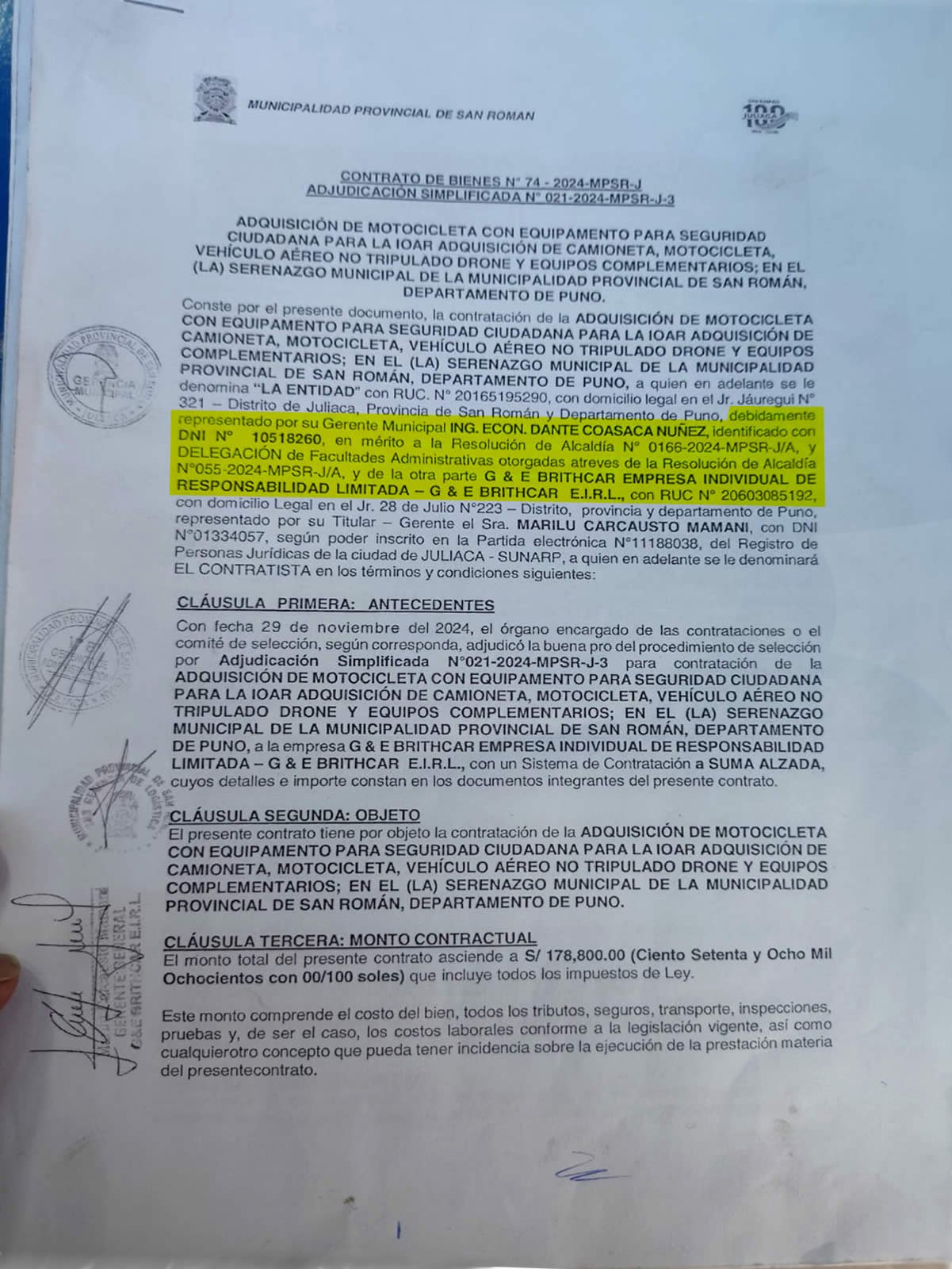 La primera licitación adjudicó seis motocicletas marca Honda por 183 mil soles mediante el contrato de bienes número 100-74-2024. Cada unidad costó aproximadamente 12 mil soles con circulina de 890 soles, según documentos presentados por el denunciante. El entonces gerente municipal Dante Coasaca Núñez firmó el contrato con la empresa G&E Brithcar.